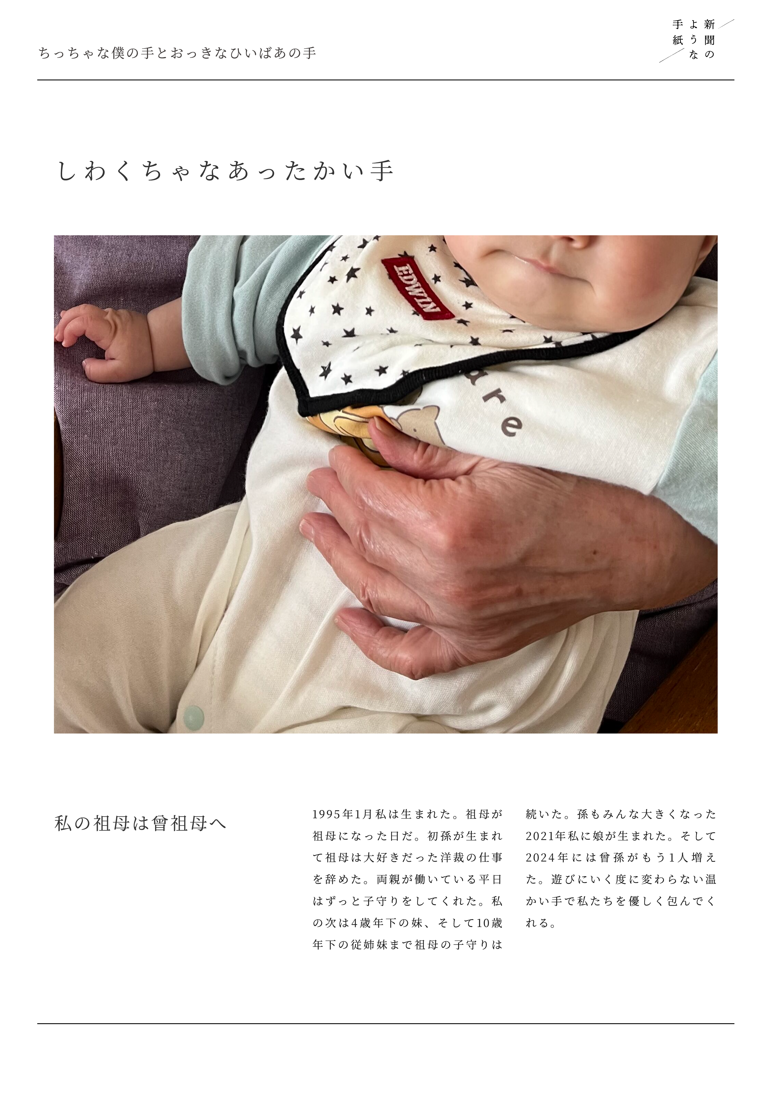 - 手の温もりがこちらまで伝わってくるような、ほのぼのとした心温まる作品ですね。なかなかおばあちゃんと小さい時に過ごすことが無くなった今は、羨ましい限りですね。